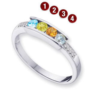 Choose polished 14k white or yellow gold only. This ring offers stone personalization for 1-4 round gemstones. Each channel-set gemstone is 2.75mm in diameter. Choose simulated or genuine gemstones. Made in USA. Both genuine and simulated stone rings have diamond accent stones .03 ct tw [ I1 clarity, G-I color]. Weight: 2.48 grams.