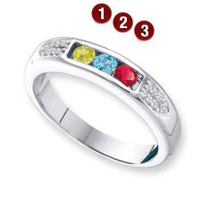Choose polished 14k white or yellow gold only. This ring offers stone personalization for 1-4 round gemstones. Each gemstone is 2.75mm in diameter. Shared prongs. Choose simulated or genuine gemstones. Made in USA. Both genuine and simulated stone rings have diamond accent stones [.05 ct tw, I1 clarity, G-I color]. Weight: 3.4 grams.