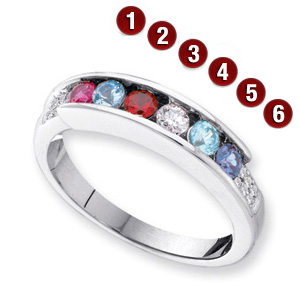 Polished 14k white gold only. This ring offers stone personalization for 1-6 round gemstones. Each channel-set gemstone is 2.75mm in diameter. Choose simulated or genuine gemstones. Made in USA. Both genuine and simulated stone rings have diamond accent stones [.05 ct tw, I1 clarity, G-I color]. Approximate weight: 3.25 grams.