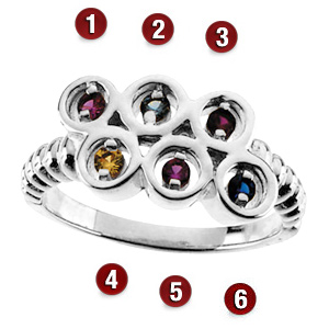 Make an elegant statement with this family ring. Each prong-set gemstone is 2mm in diameter. It is available with simulated or genuine birthstones. Sterling silver only.