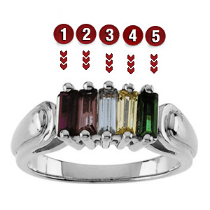 Make an elegant statement with this family ring. Each prong-set gemstone is 5mm by 2mm. It is available with simulated or genuine birthstones. Sterling silver only.
