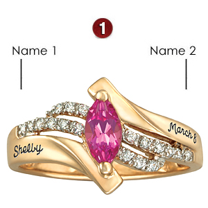 Select a birthstone color for one stone. The center stone is a 7x3.5mm marquise. The center stone sits above 18 x 1mm round cubic zirconias. Engrave up to 10 characters in each of two engraving areas.