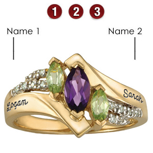Select a birthstone color for three marquise cut genuine gemstones on the 14kt white gold Dawning ring. The center stone is 7x3.5mm; the two smaller marquise stones are 5x2.5mm. Choose genuine white topaz or diamond accents. Engrave up to 10 characters in each of two engraving areas.
