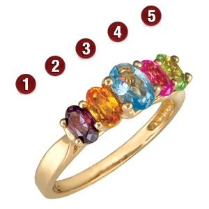 Celebrate your loved ones and memories with this elegant ring. Sparkling oval stones share prongs on this instant family heirloom. Stone details: 4 - 5x3mm oval; 1 - 6x4mm oval center stone for Mom. Available in white or yellow, 10k or 14k gold, with simulated or genuine birthstones.