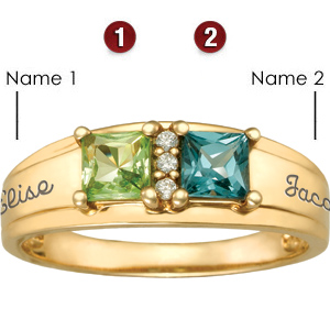 Choose two 4mm princess cut simulated gemstones and engraved names for the 14kt yellow gold True Love promise ring. Engrave up to 12 characters in each of two engraving areas. Three 1.25mm round accent cz stones. Band's top width: 5mm. Import.