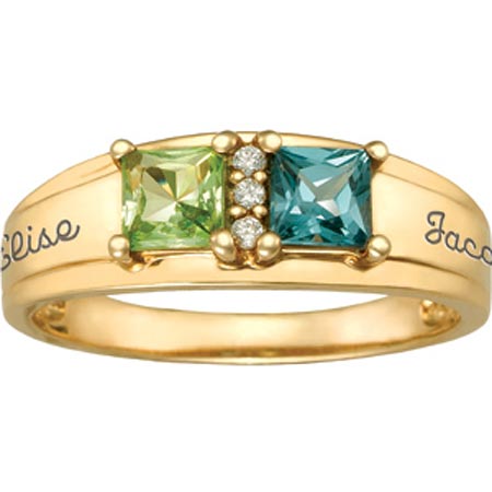Choose two 4mm princess cut genuine gemstones and engraved names for the 10kt yellow gold True Love promise ring. Engrave up to 12 characters in each of two engraving areas. Three 1.25mm round accent cz stones. Band's top width: 5mm. Import.