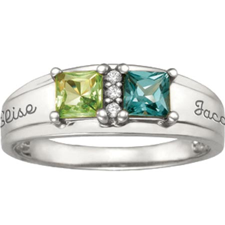 Choose two 4mm princess cut genuine gemstones and engraved names for the 10kt white gold True Love promise ring. Engrave up to 12 characters in each of two engraving areas. Three 1.25mm round accent cz stones. Band's top width: 5mm. Import.