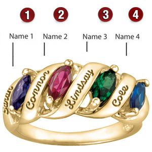The 14kt yellow gold Melodic Marquis ring is adorned with four 6mm by 3mm marquise cut genuine birthstones. Engrave up to 10 characters in each of four engraving areas. Import.