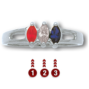 The sterling silver Memorable Marquise ring offers personalization for three marquise-cut genuine gemstones. The Memorable Marquise ring measures about 6mm at the top center. Stone size: 5mm by 2.5mm. Made in USA.