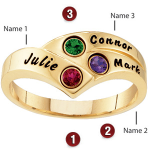 Designed and produced in California, the 14kt yellow gold Family Twist ring offers three genuine round gemstones and corresponding engravings. Each gemstone is 2.50mm in diameter. Each engraving area accommodates up to 7 characters [letters and spaces]
