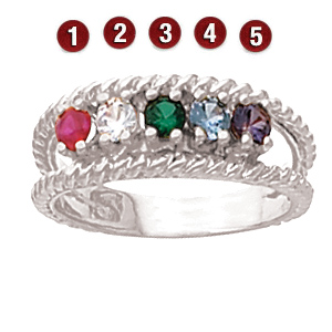 The sterling silver twisted rope mother's ring offers your choice of five round genuine gemstones. Each prong-set gemstone is 3mm in diameter. Handcrafted to order.