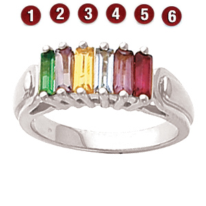 Make an elegant statement with this family ring. Each prong-set gemstone is 5mm by 2mm. It is available with simulated or genuine birthstones. Sterling silver only.