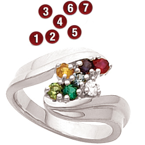 The sterling silver embracing arms mother's ring is set with your choice of seven simulated round 3mm gemstones. Made in the USA.