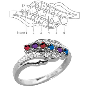 The Jubilee mother's ring is set with 3 to 6 gemstones of your choice. Each round gemstone is 2mm in diameter. For a particularly stunning look, upgrade to diamond accents from cubic zirconia. Six accent stones are always set in each Jubilee ring. Estimated ring top width: 8.16mm. Estimated palm width: 1.65mm. This mother's ring is available with simulated or genuine birthstones.