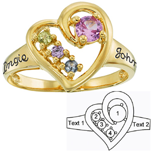 The Inamorata birthstone ring is set with one large gemstone and three small gemstones. Choose a gemstone for each of the four positions. This birthstone ring is available with simulated or genuine birthstones. There are two engraving spaces that can hold up to 10 characters. This ring is available in 14kt or 10kt yellow or white gold.