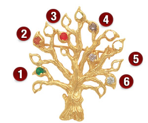 Tree of Life Pin with 6 simulated birthstones in 10kt yellow gold