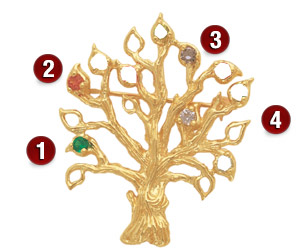 Tree of Life Pin with 4 genuine birthstones in 14kt yellow gold