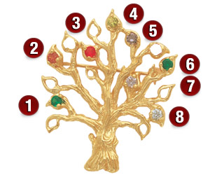 Tree of Life Pin with 8 simulated birthstones in 14kt yellow gold