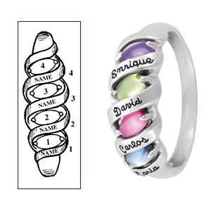 The Ribbons Of Love ring features personalization of up to 2 to 7 names and corresponding birthstones.It is available with either synthetic or genuine cabochon birthstones. Also available in 10K or 14K yellow or white gold.