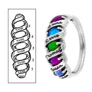 The Ribbons Of Love ring features personalization of up to 2 to 7 names and corresponding birthstones.It is available with either synthetic or genuine cabochon birthstones. Also available in 10K or 14K yellow or white gold.