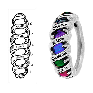 The Ribbons Of Love ring features personalization of up to 2 to 7 names and corresponding birthstones.It is available with either synthetic or genuine cabochon birthstones. Also available in 10K or 14K yellow or white gold.