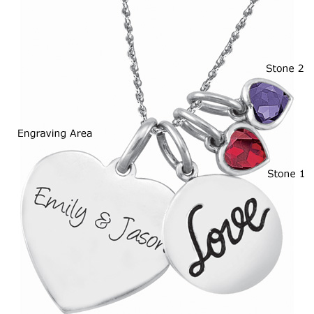 The Sweet Love Charm Necklace includes an 18in sterling silver rope chain, two heart stone charms, a heart shaped charm and a round Love charm. Choose two simulated stone colors and 1 or 2 lines of engraving. Engrave up to 12 characters in each engraving area. Antique finish. Imported.