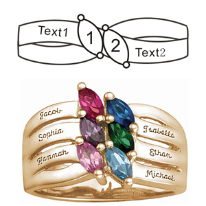 Choose two marquise cut simulated birthstones and engravings for the 10kt yellow gold Honor mother's ring. Each prong set gemstone is 5mm x 2.5mm. Engrave up to 12 characters per engraving area. Import.