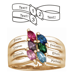 Choose three marquise cut simulated birthstones and engravings for the 10kt yellow gold Honor mother's ring. Each prong set gemstone is 5mm x 2.5mm. Engrave up to 12 characters per engraving area. Import.