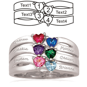 Choose 2-6 heart shaped birthstones. Each prong gemstone is 3mm. This mother's birthstone ring is available with simulated or genuine birthstones. Engrave up to 12 characters per engraving area.