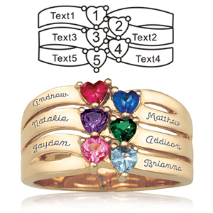 Choose 2-6 heart shaped birthstones. Each prong gemstone is 3mm. This mother's birthstone ring is available with simulated or genuine birthstones. Engrave up to 12 characters per engraving area.