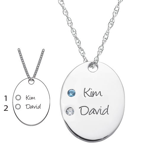 The sterling silver Always necklace offers your choice of gemstone and engraving. Oval charm dimensions: 16.6mm x 21.75mm. This item is the size of a nickel. Choose two 2mm round simulated or genuine birthstones. Each engraving area accommodates up to 12 characters, including spaces and punctuation. 18in sterling silver chain. Imported.