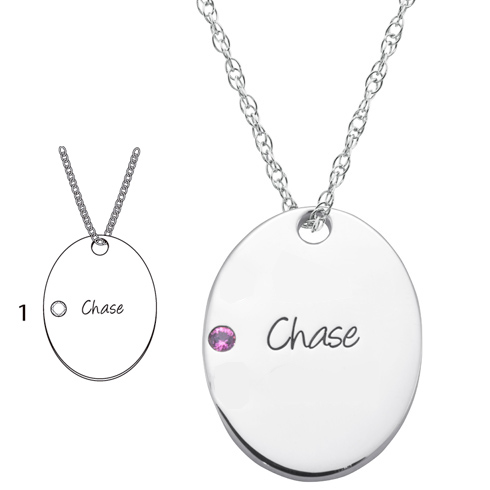 The sterling silver Always necklace offers your choice of gemstone and engraving. Oval charm dimensions: 16.6mm x 21.75mm. This item is the size of a nickel. Choose a 2mm round simulated or genuine birthstone. The engraving area accommodates up to 12 characters, including spaces and punctuation. 18in sterling silver chain. Imported.