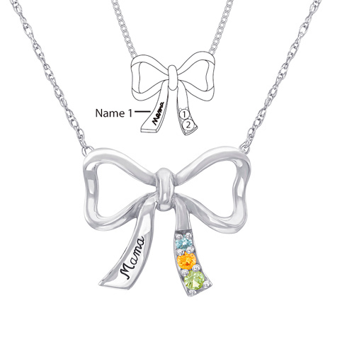 The sterling silver Ribbon necklace offers your choice of gemstone and engraving. Ribbon dimensions: 20.4mm x 18.2mm. This item is the size of a dime. Stone diameters: 2.5mm, 2.2mm. Each engraving area accommodates up to 12 characters, including spaces and punctuation. 18in sterling silver chain. Imported.