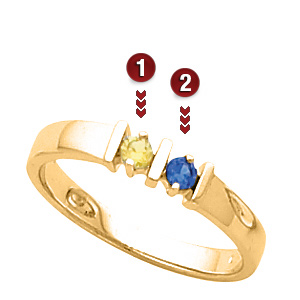 This ring features personalization for 2-6 birthstones. Each prong-set gemstone is 2.5mm in diameter. It is available with simulated or genuine birthstones. 14kt yellow gold only.