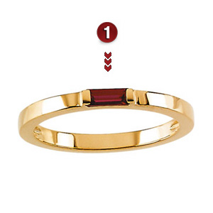 The Tenderness stackable mother's ring is part of our signature stackable collection. Made in the USA, this ring features personalization for 1-3 straight baguettes. Each bezel set gemstone is 5mm x 2mm. Choose 14kt yellow or white gold. The Tenderness is slender and designed to be worn in multiples. Ring width: 2.25mm. This mother's birthstone ring is available with simulated or genuine birthstones.