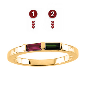 The Tenderness stackable mother's ring is part of our signature stackable collection. Made in the USA, this ring features personalization for 1-3 straight baguettes. Each bezel set gemstone is 5mm x 2mm. Choose 14kt yellow or white gold. The Tenderness is slender and designed to be worn in multiples. Ring width: 2.25mm. This mother's birthstone ring is available with simulated or genuine birthstones.
