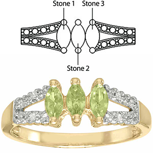 The 10kt yellow gold Glimmer ring has three genuine marquise gemstones set with fiery white accents. Each prong set marquise stone is 5mm x 2.5mm. Each round accent stone is 1mm in diameter. Import.