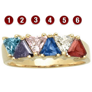 The 14kt yellow gold Forever Yours mother's ring features six 4x4x4mm trillion cut genuine gemstones. Prong-set. Made in the USA.
