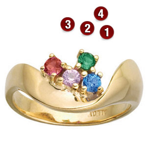 The curving graceful design features 2.75mm round gemstones. Choose one to six gemstones. Each is prong-set. Ring is available in white or yellow, 10k or 14k gold, with simulated or genuine birthstones.