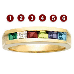 Classic design features 3.0mm princess cut gemstones. Choose one to six gemstones. Each is channel-set. Ring is available in white or yellow, 10k or 14k gold, with simulated or genuine birthstones.