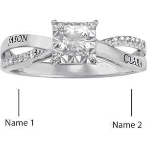 The sterling silver Lovely promise ring features a 4mm square brilliant created sapphire and two names. 12 x 1mm round created sapphire accent stones are set in the shank. Engrave up to 12 characters per name. Engravings are always in capital letters. Top width: 6.3mm, palm width: 2.3mm. Import.