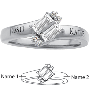 The sterling silver Adoration ring is decorated with two 5mm x 2.5mm created sapphire baguettes and two names. Four 1.5mm round created sapphire accent stones. Engrave up to 12 characters per name. Engravings are always in capital letters. Top width: 7.95mm, palm width: 2.75mm. Import.