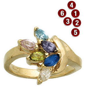 Give Mom flowers that will never wilt! This bouquet inspired design features 5x2.5mm marquise gemstones. Choose one to six gemstones. Each is prong-set. Ring is available in white or yellow, 10k or 14k gold, with simulated or genuine birthstones.