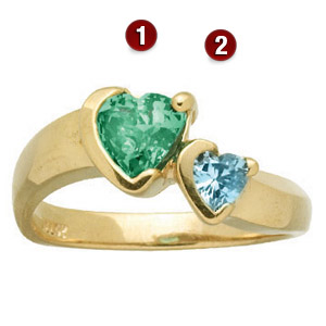 Honor a mother's love. This ring features a 6x6mm and 4x4mm heart shaped gemstones. Choose two to seven gemstones. Each is prong-set. Ring is available in white or yellow, 10k or 14k gold, with simulated or genuine birthstones. This ring is not available with one gemstone.