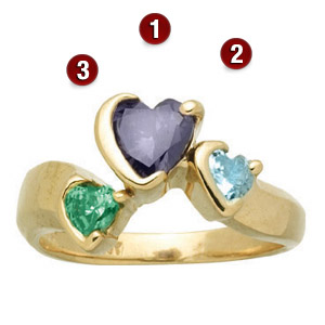 Honor a mother's love. This ring features a 6x6mm and 4x4mm heart shaped gemstones. Choose two to seven gemstones. Each is prong-set. Ring is available in white or yellow, 10k or 14k gold, with simulated or genuine birthstones. This ring is not available with one gemstone.