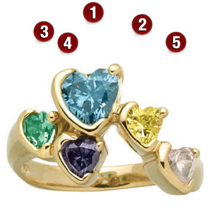 Honor a mother's love. This ring features a 6x6mm and 4x4mm heart shaped gemstones. Choose two to seven gemstones. Each is prong-set. Ring is available in white or yellow, 10k or 14k gold, with simulated or genuine birthstones. This ring is not available with one gemstone.