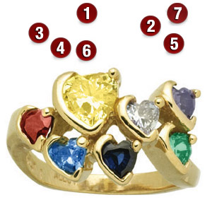 Honor a mother's love. This ring features a 6x6mm and 4x4mm heart shaped gemstones. Choose two to seven gemstones. Each is prong-set. Ring is available in white or yellow, 10k or 14k gold, with simulated or genuine birthstones. This ring is not available with one gemstone.