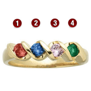 Gorgeous ribbons of 14kt white gold surround four genuine 3mm round gemstones on this Harmony mother's ring. Each round gemstone is prong-set. Made in USA.