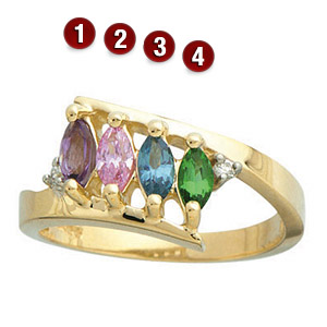 Tradition with a touch of glamour! Open-style band promotes maximum brilliance and light. Choose one to six 5x2.5mm marquise stones. Each is prong-set. Two diamond accents. Ring is available in white or yellow, 10k or 14k gold, with simulated or genuine birthstones.