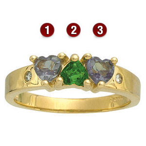 Honor a mother's love. This ring features 4x4mm heart shaped gemstones and two diamond accents. Choose one to six gemstones. Each is prong-set. Ring is available in white or yellow, 10k or 14k gold, with simulated or genuine birthstones.